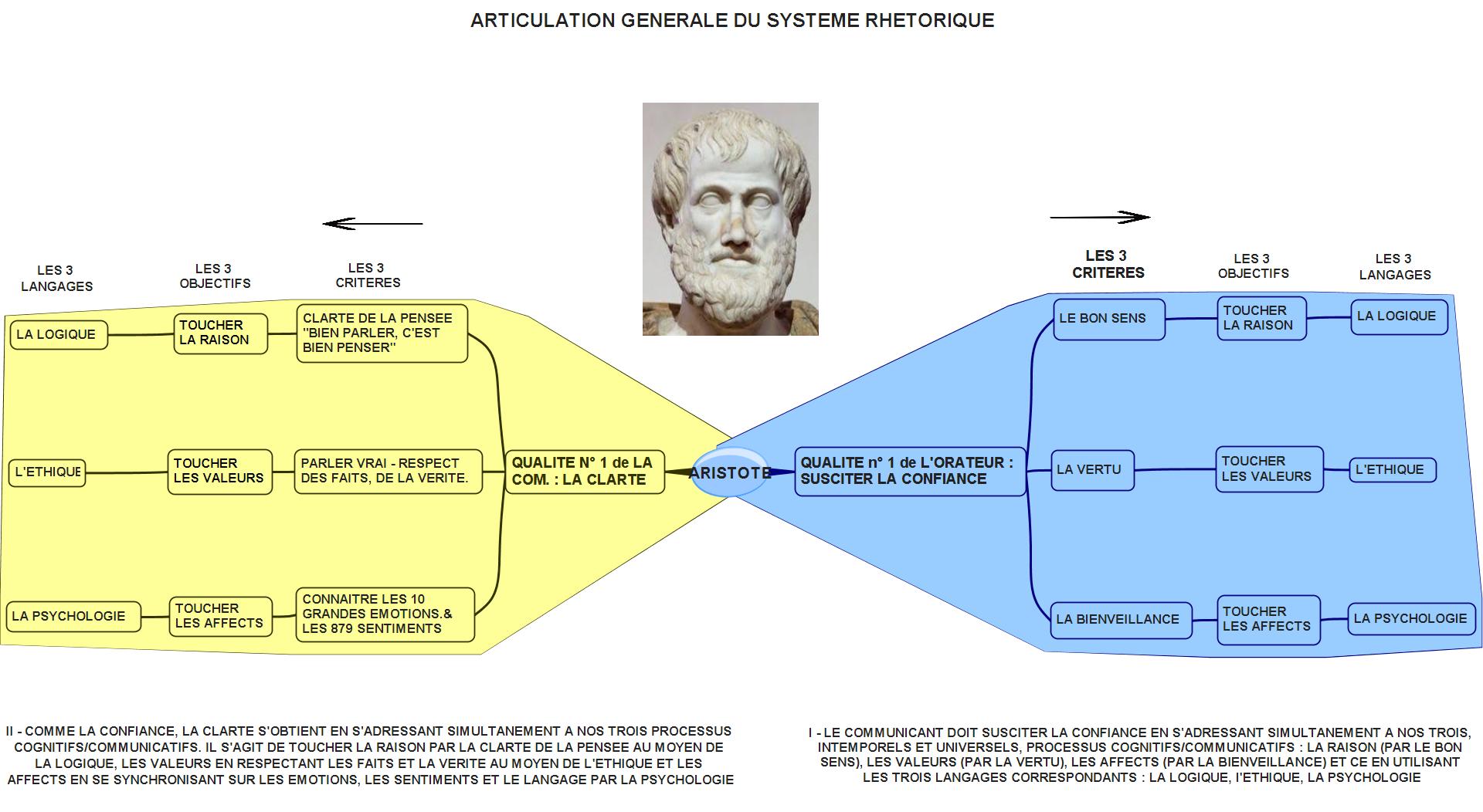 La MindMap qui illustre cet article représente l’articulation générale du système rhétorique. Nous venons de voir que, selon Aristote, ce système repose sur deux concepts dont le caractère est le plus général possible : la qualité principale de l’orateur, qui est de susciter la confiance et la qualité principale de la communication proprement dite qui est celle de la clarté. (Cf. Aristote, Rhétorique, livre II, sections V, VI, VII et VIII).