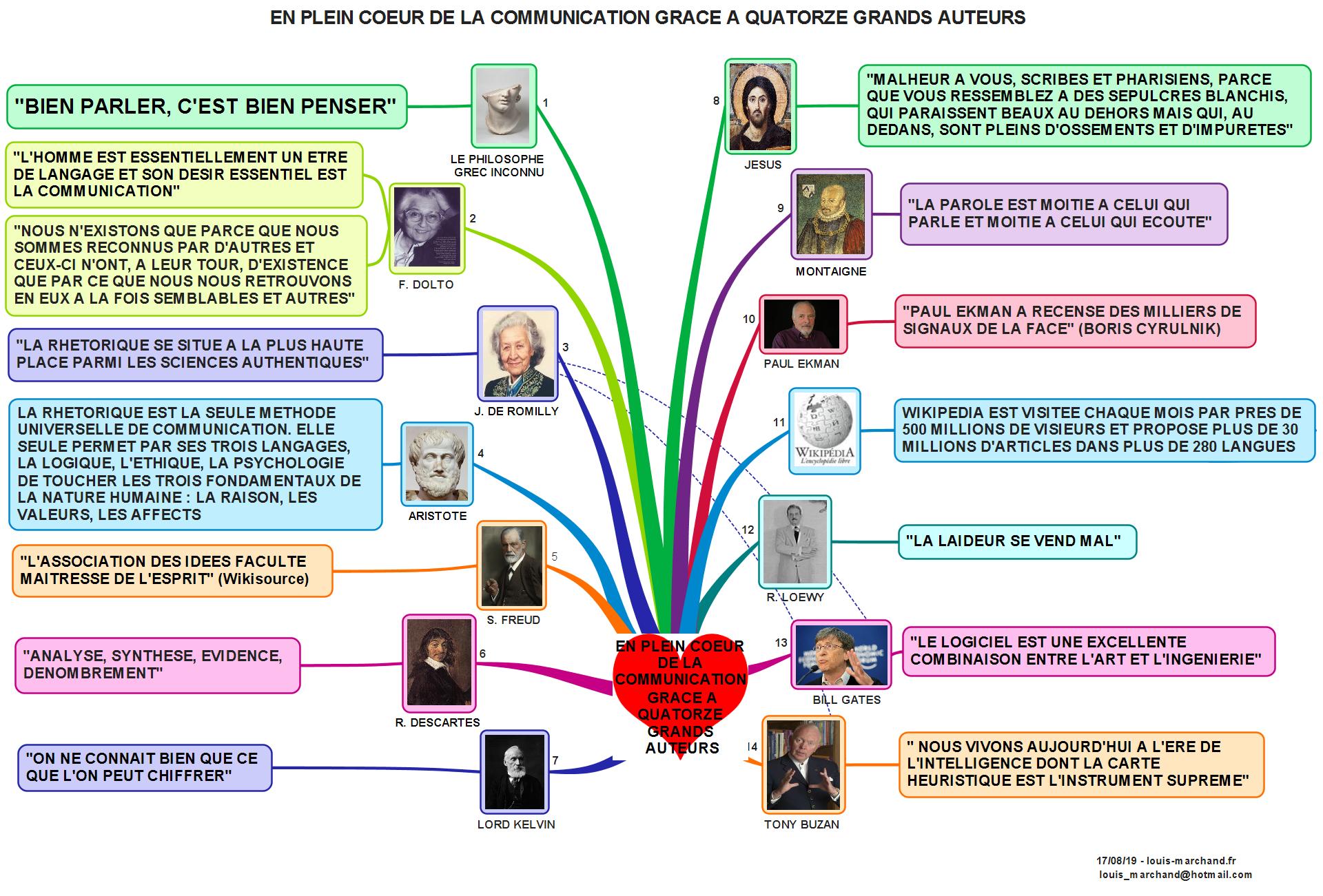 Ces quatorze citations vont du général au particulier et de la rhétorique proprement dite aux N.T.I.C.(1) en commençant, sur la partie gauche de la Mind Map, par celle que j’attribue au « Philosophe grec inconnu » (n° 1) et en se poursuivant, sur la partie droite, par celle de Jésus-Christ (n° 8).