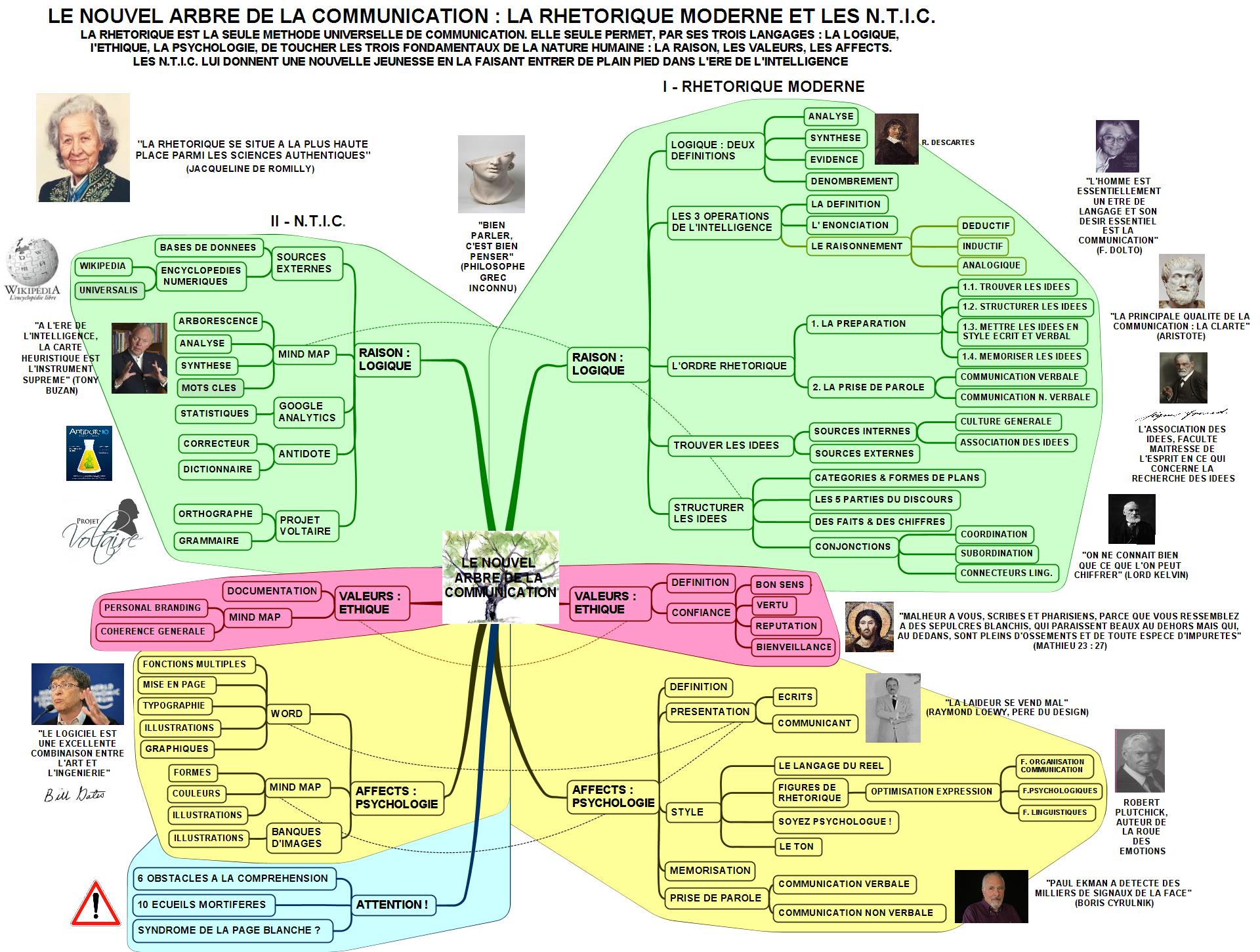 L’arbre de la communication que je propose tient tout entier dans la Mind Map ci-dessus laquelle est divisée en deux parties : à droite la rhétorique moderne, à gauche les N.T.I.C.(1) Chacune de ces parties est subdivisée en fonction des trois langages de la rhétorique : la logique, l’éthique et la psychologie. Chaque langage utilise donc simultanément la rhétorique et les N.T.I.C.