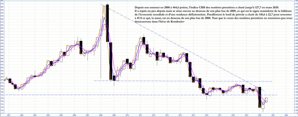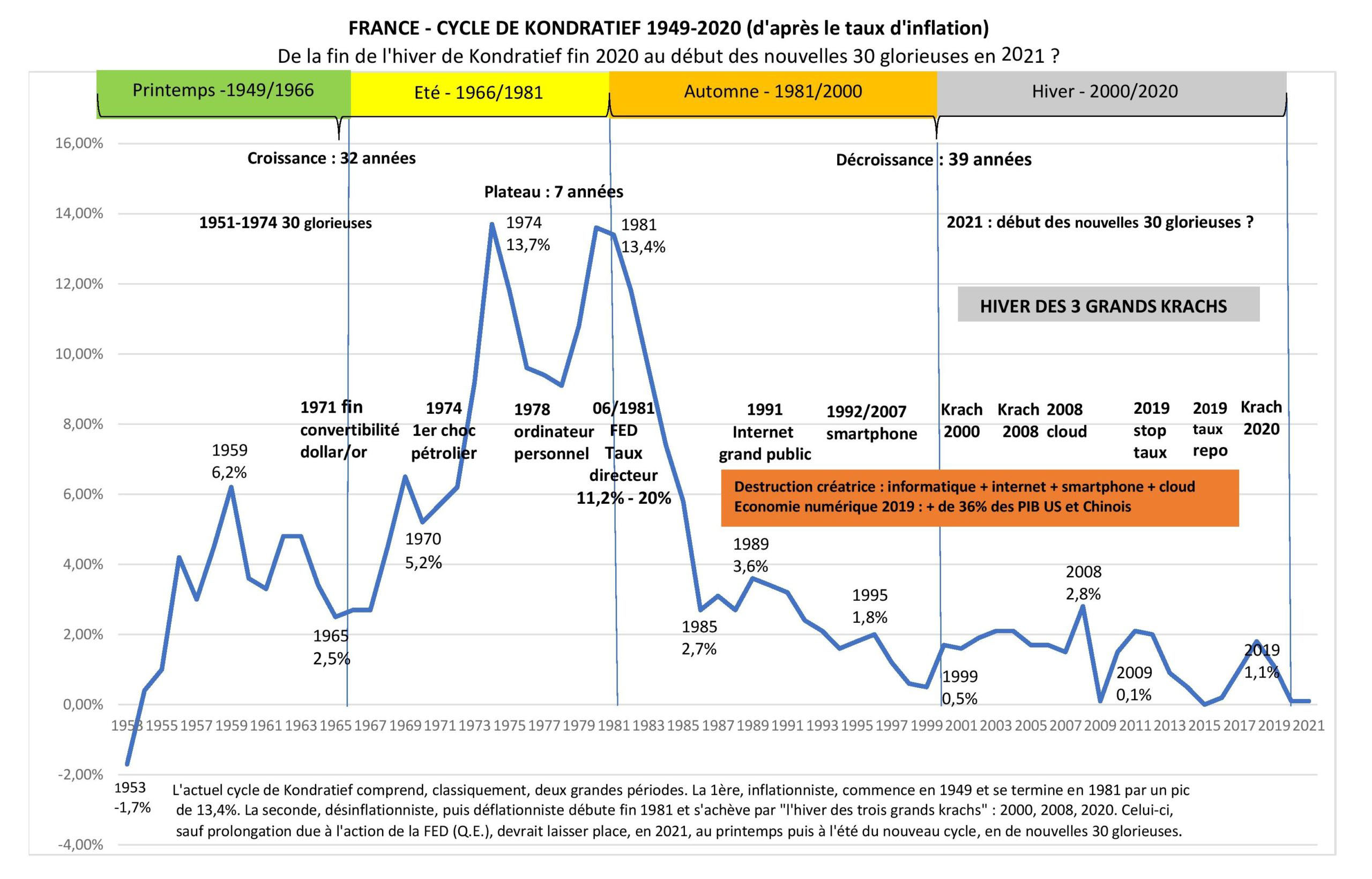 « les principaux critères qui permettent de penser que nous vivons bien les derniers mois de l’hiver du cycle actuel, “hiver des trois grands krachs” et que nous sommes donc bien à la veille du printemps du prochain cycle, c’est-à-dire à la veille des prochaines trente glorieuses » J’indiquais « qu’il y a des signaux très forts en faveur de cette hypothèse mais que la Covid 19 ne semble pas avoir dit son dernier mot ».