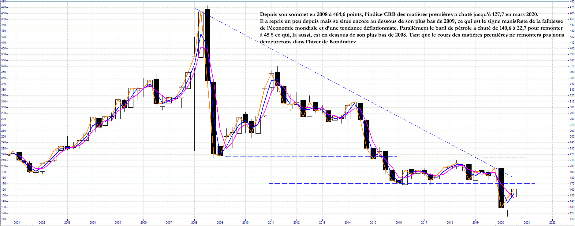 Les deux principaux indicateurs qui sont voisins de leur minima sont ceux des matières premières (Indice CRB, représenté dans le premier graphique ci-dessous) et des frets (Baltic Dry Index), lequel suit exactement la même tendance que le CRB, mais n’est pas représenté.