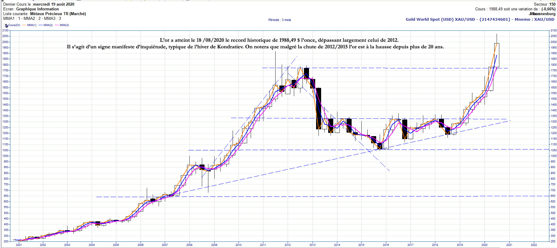 À la date de cet article, le prix de l’or est voisin de 2000 dollars l’once, ce qui est plus élevé que son record de 2012 et tout à fait en phase avec le sentiment d’inquiétude qui est en général ressenti dans l’hiver de Kondratiev. L’opinion publique ne semble pas du tout avoir basculé vers le printemps, à fortiori depuis la COVID 19. De ce fait, les spécialistes estiment que la hausse du cours de l’or n’est pas près de s’arrêter, ce qui correspondrait donc à une continuation de l’hiver. On notera qu’en dépit de la forte correction de 2012-2015 l’or est en hausse depuis 1999 et qu’il est de plus en plus considéré comme une monnaie et non comme une simple matière première.