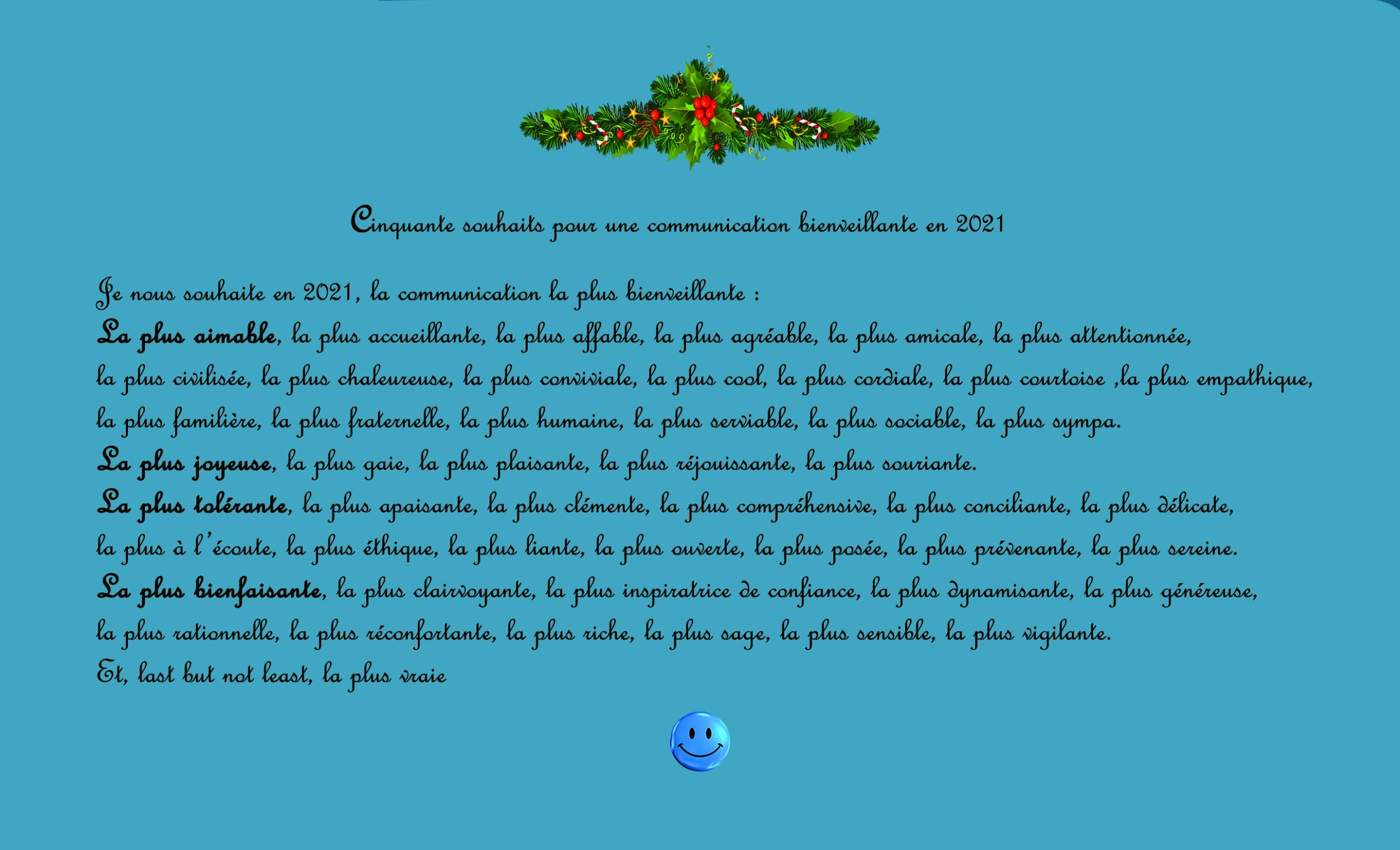 Chers amis, certains d’entre vous se souviendront peut-être que fin 2015 je vous souhaitais déjà à la manière, très imparfaite, de Madame de Sévigné, une communication bienveillante pour l’année 2016. Comme beaucoup, sans doute, je n’imaginais nullement alors la prolifération actuelle de la violence, des fake news et des thèses complotistes dans les médias, notamment dans les réseaux sociaux. Cinq ans plus tard, je vous propose dans mes vœux pour 2021 cette nouvelle version, sous la forme de cinquante souhaits qui se veulent, plus que jamais, comme autant de messages d’espoir :