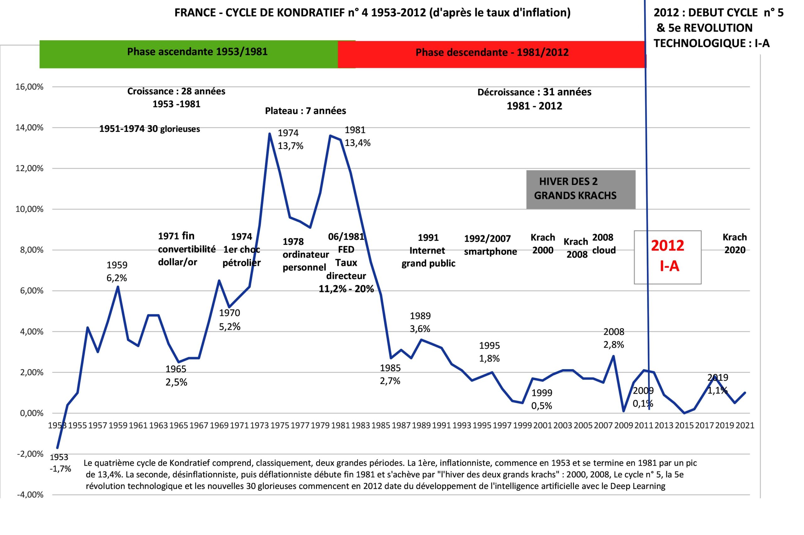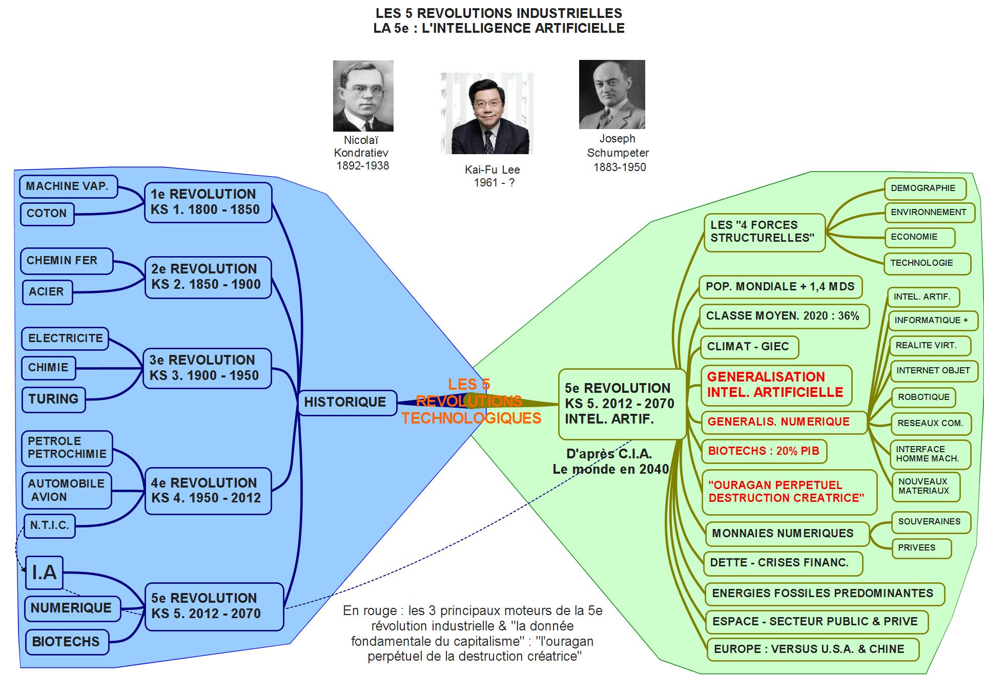 Nous avons vu que selon Kondratieff et Schumpeter les changements de cycles économiques sont indissociablement liés aux révolutions technologiques. En ce qui concerne le cinquième cycle, qui a commencé en 2012, la révolution concernée est, à l’évidence, bien qu’elle ne soit pas encore officiellement reconnue, celle de l’intelligence artificielle avec la technologie de rupture radicalement novatrice qu’est le deep learning.
