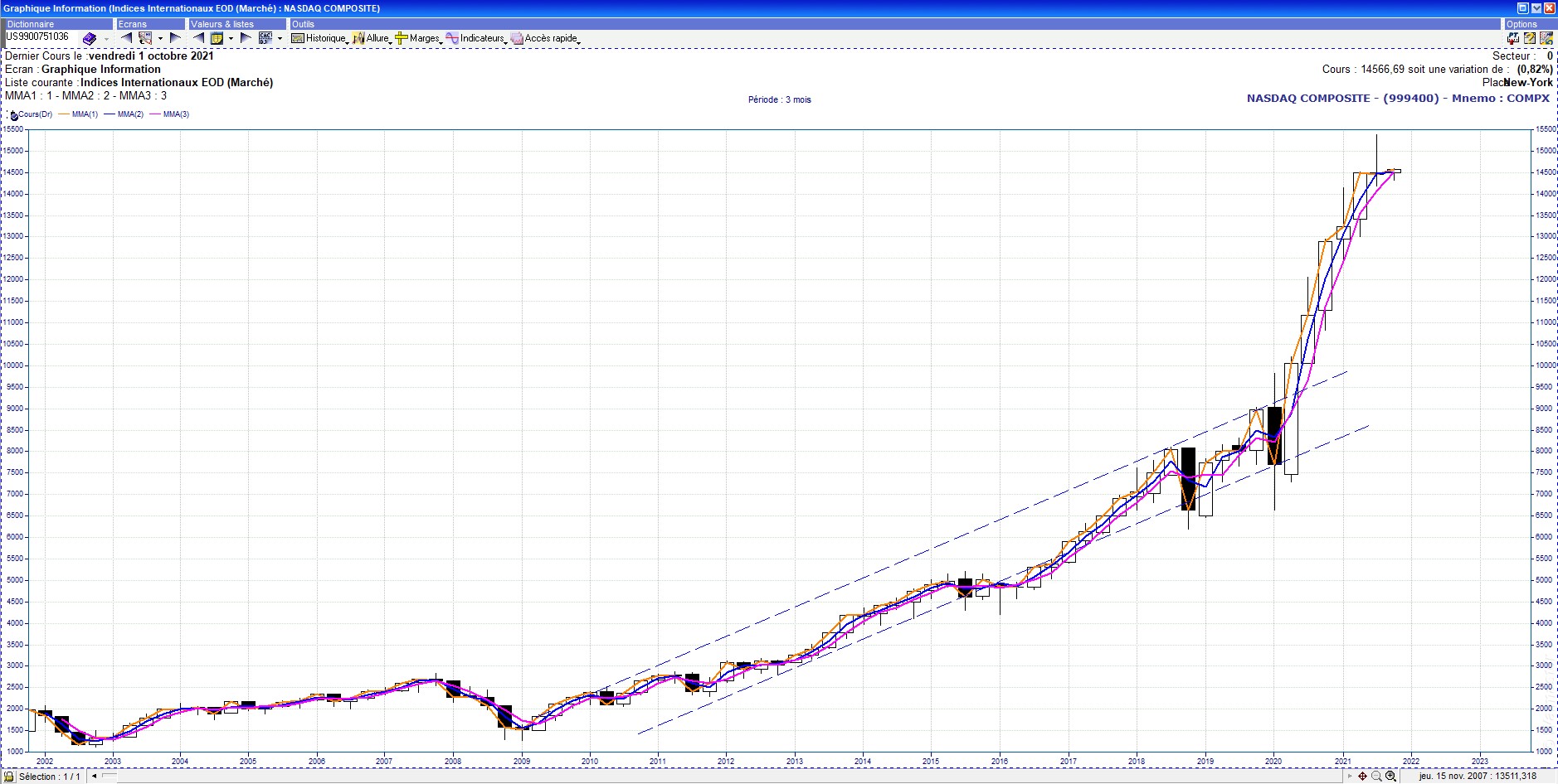Ainsi avons-nous pu constater que l’indice Nasdaq des valeurs technologiques est en forte hausse depuis près de douze ans et, qu’à l’inverse, l’indice CRB des matières premières était en forte baisse pendant la même durée jusqu’en mars 2020, date de son retournement en forte hausse.